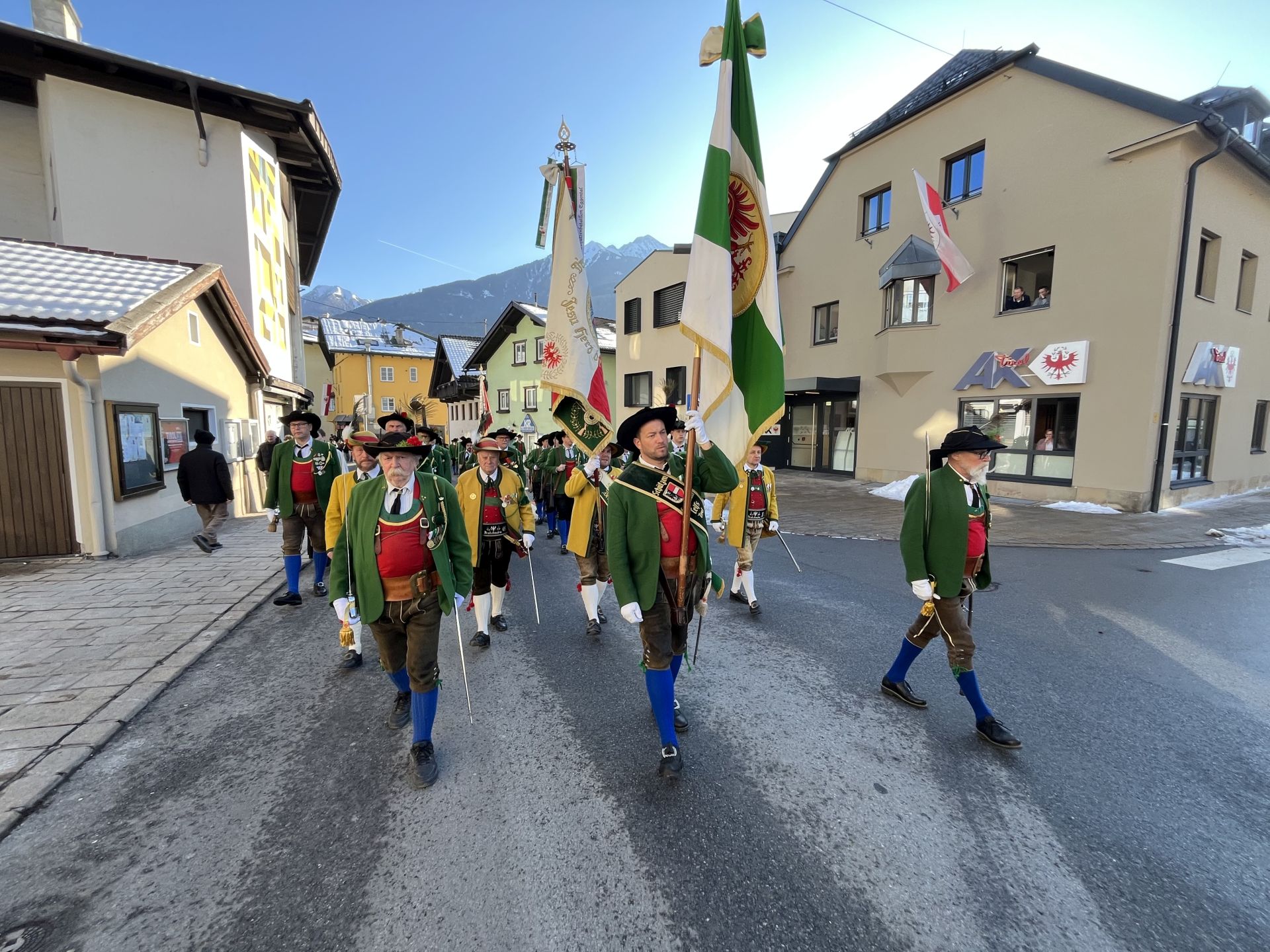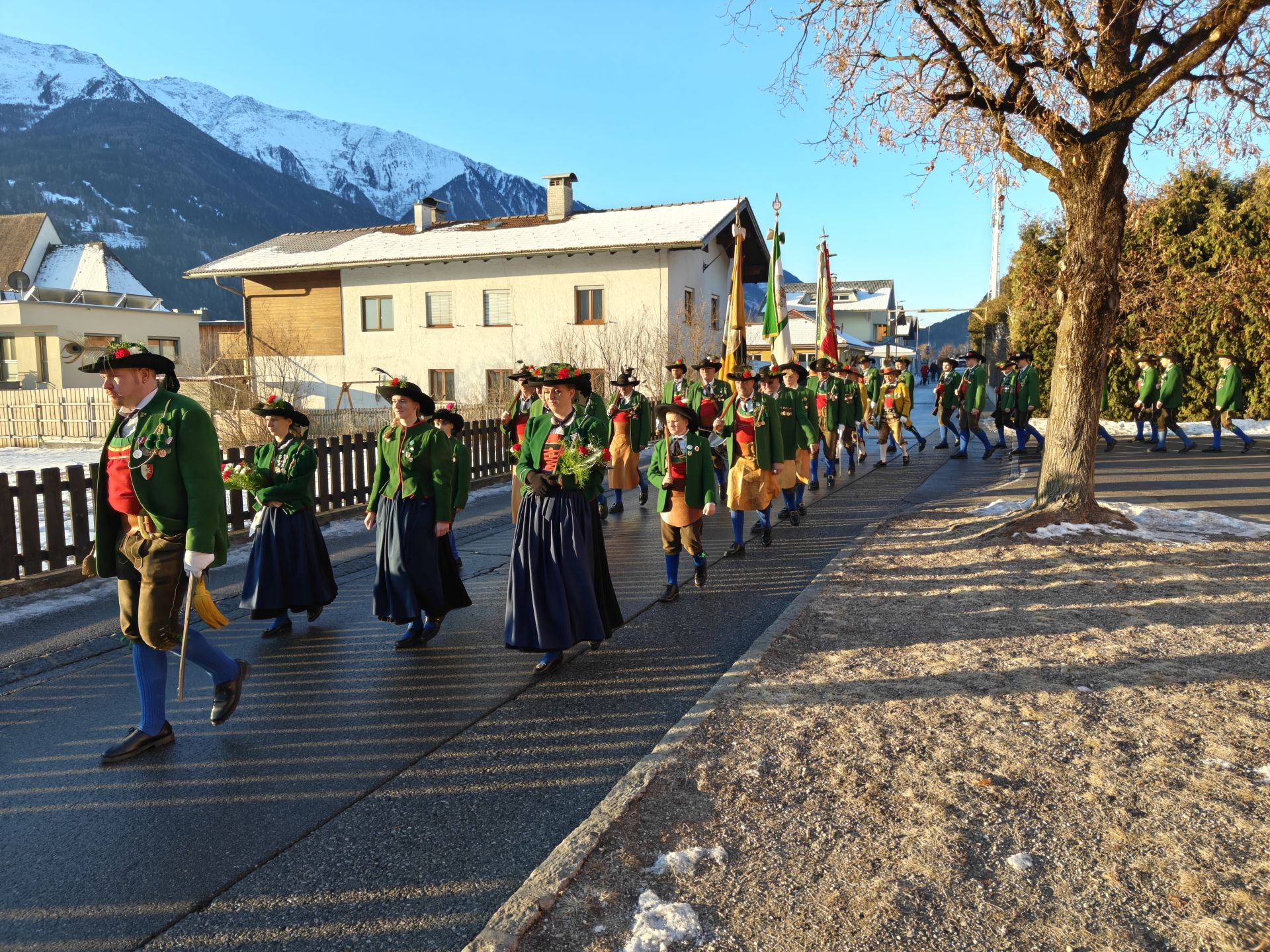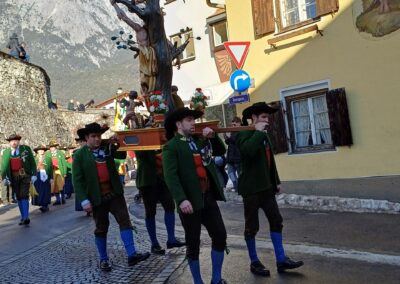 Nach dem gemeinsamen Marsch mit der Marktmusikkapelle Telfs durch das Dorf in der verkehrten Prozessionsrunde brachte Hauptmann Trostberger die Kompanie für die Prozession in Stellung. Bei blauem Himmel fand die feierliche Prozession mit allen Abordnungen, Fahnen, Farggelen und der zahlreich erschienen Bevölkerung statt.