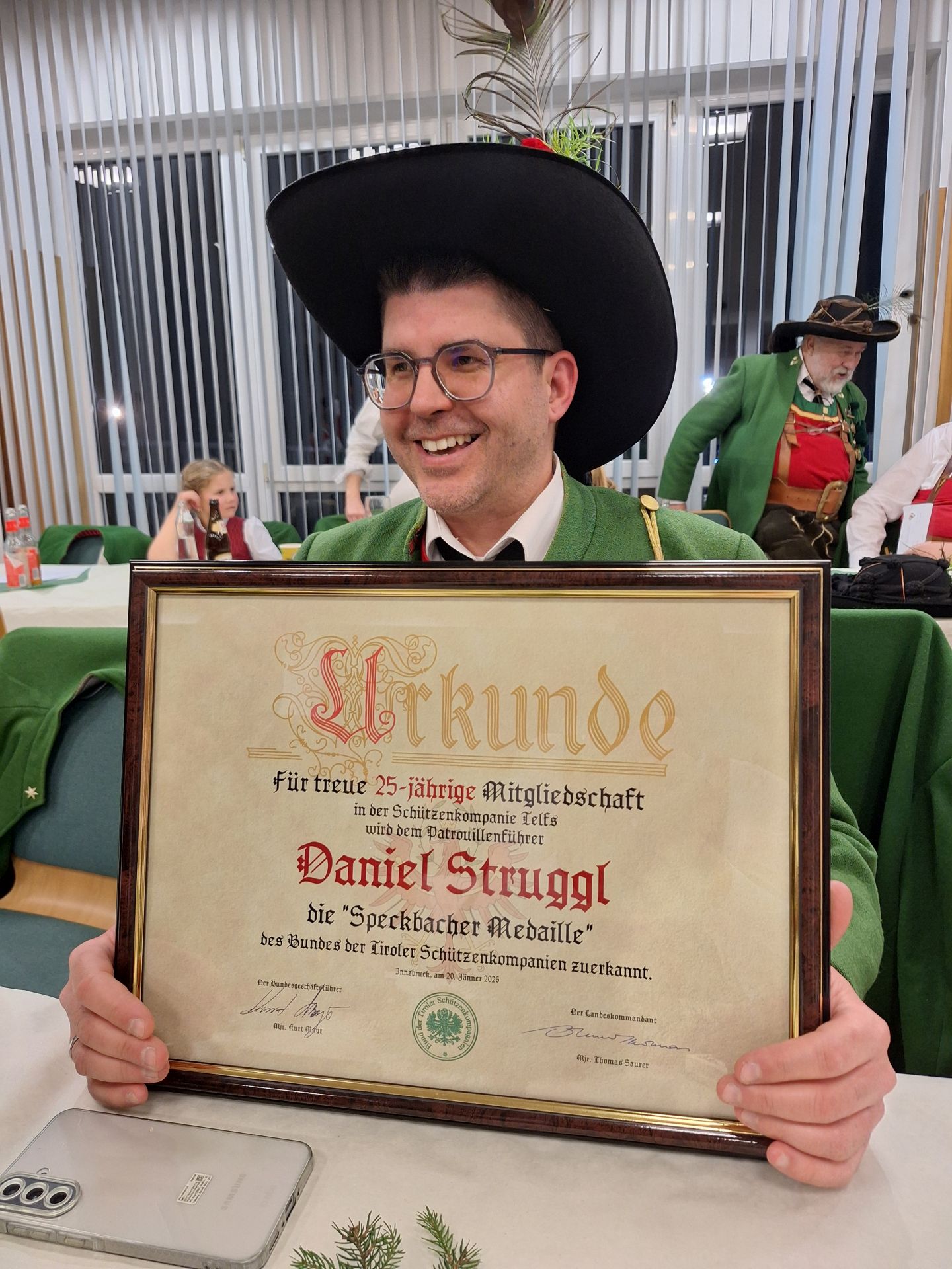 Philipp Thöni und Patrick Krismer wurde für 15-jährige Mitgliedschaft die “Pater-Haspinger-Medaille“ in Bronze verliehen, Uj. Hubert Agerer und Ptf. Daniel Struggl erhielten für 25-jährige Mitgliedschaft die “Josef-Speckbacher-Medaille“ in Silber. Für 40-jährige bzw. 50-jährige Mitgliedschaft wurde Uj. Heinz Neuner bzw. Zgf. Franz Stubenböck sen. die “Andreas-Hofer-Medaille“ in Gold verliehen. Manfred Tabelander wurde zum Unterjäger befördert. Bereits am Vormittag wurde Uj. Norbert Raffeiner die Sebastiani-Verdienstmedaille der Marktgemeinde Telfs verliehen.